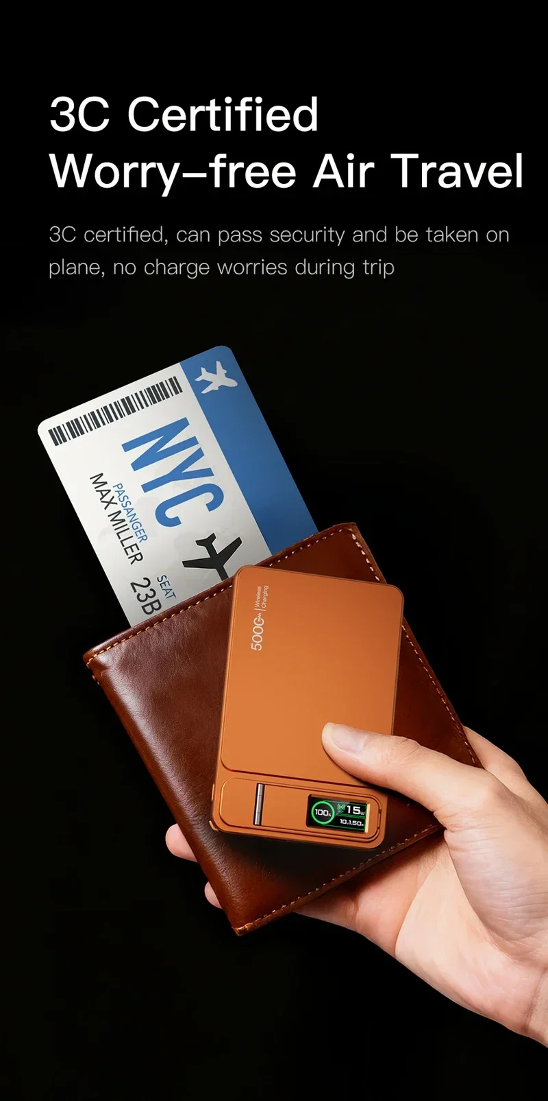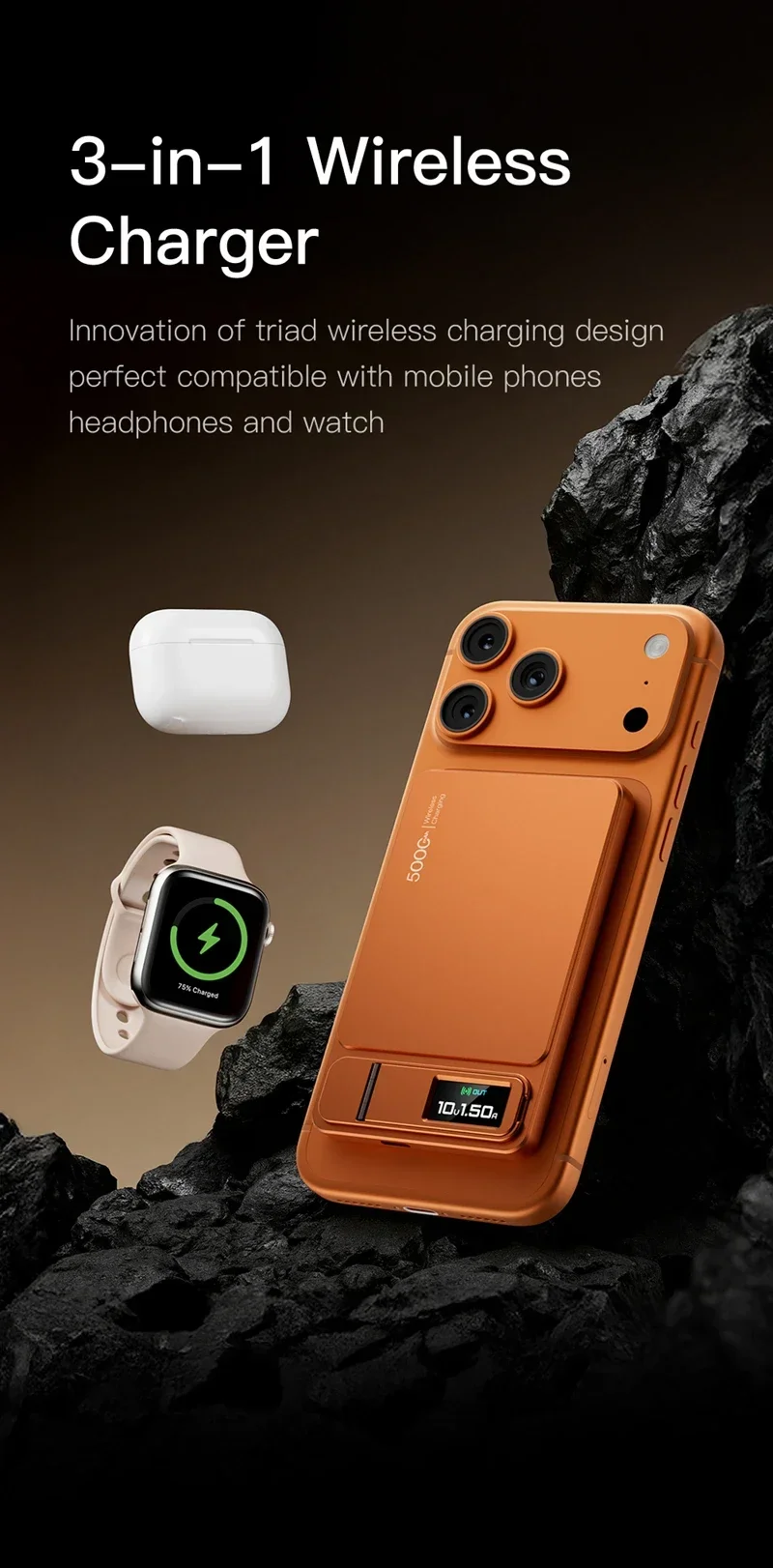 Adopts MagSafe strong magnetic adsorption design, which fits tightly and stably on devices like iPhones without shaking—just attach it to start wireless charging. It also supports simultaneous wireless charging for three devices (phone, smartwatch, Bluetooth earbuds), so you only need to bring this one power bank when going out to handle multi-device battery life, ditching messy charging cables.